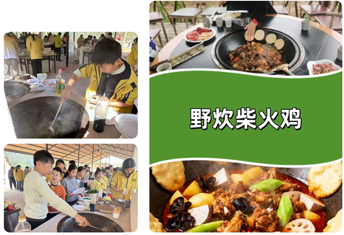 【做柴火鸡·亲子共享】前往亲子厨房区,体验柴火灶烹饪:亲子协作处理食材、生火、炖煮柴火鸡,品尝自制美食,享受午餐时光。