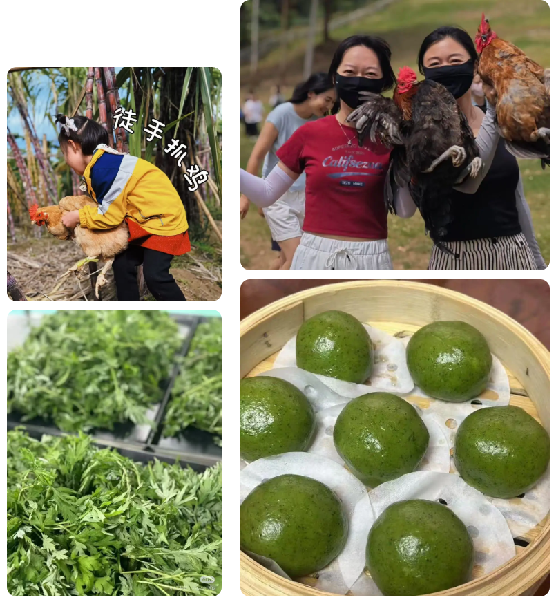 【做柴火鸡·亲子共享】前往亲子厨房区,体验柴火灶烹饪:亲子协作处理食材、生火、炖煮柴火鸡,品尝自制美食,享受午餐时光。