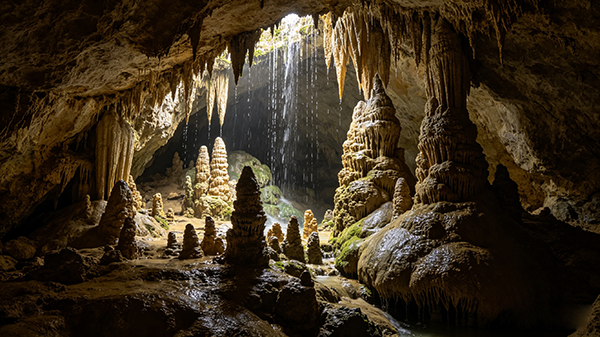 寻龙山被誉为“天然的地质博物馆”,这里藏着亚洲罕见、世界罕见的砾岩溶洞——卧龙洞,两亿年前的火山喷发造就了这片奇特地貌,洞内钟乳悬垂、石笋林立,水路蜿蜒,乘船穿行其中,仿佛闯入地心秘境,沉浸式感受亿万年地质演变的奇迹。