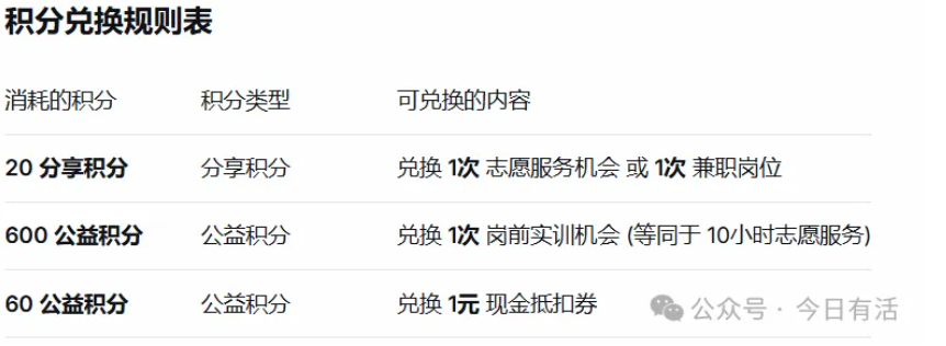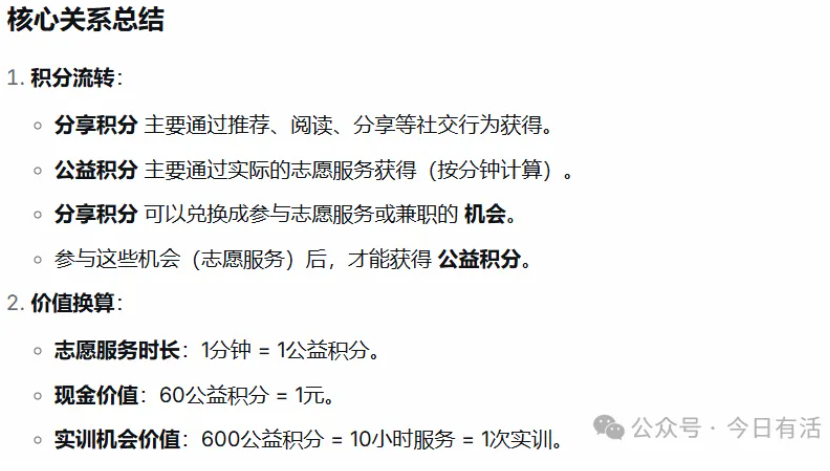 这个体系鼓励用户通过分享和推荐来获取参与志愿服务或兼职的资格,并通过实际付出(志愿服务)来积累更有价值的公益积分,最终兑换实训机会或现金抵扣券。